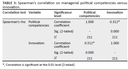 In assessing the effect of managerial political competencies on firm performance as measured by innovation, Spearman's correlation coefficient was used.