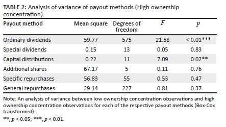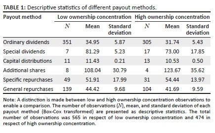 RESEARCH DESIGN, APPROACH, AND METHOD: An empirical research design was followed, which is descriptive in nature. Descriptive statistics and a mixed-model analysis of variance were employed to describe the different payout methods - that is ordinary dividends, special dividends, capital distributions, additional shares, general share repurchases, and specific share repurchases - employed by companies listed on the JSE based on a distinction between low and high ownership concentration.