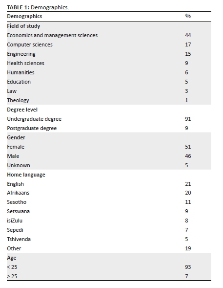 From Table 1, it can be noted that the majority of students indicated that their field of study is in economics and management sciences (44%), they are in the process of obtaining an undergraduate degree (91%) and they are under the age of 25 years (93%) and primarily speak English (21%) or Afrikaans (20%). The gender distribution was relatively equally dispersed between females (51%) and males (46%), with 3% of respondents not disclosing their gender. The demographic information relates to the demographics of the larger South African population in that each of the 11 national languages of the country was represented in the study. Once the questionnaires had been screened and demographics computed, the data set was subjected to an exploratory factor analysis to assert the data's factorability.