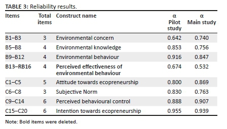 As depicted in Table 3, the construct with the highest Cronbach alpha value is the intention towards ecopreneurship construct (0.939), which is similar to the reported value (0.943) in the study from which the intention towards entrepreneurship construct was adapted from (Liñán & Chen 2009). Compared to their original sources, all the constructs in this study had lower Cronbach alpha values, except the perceived behavioural control and the environmental behaviour constructs. In this study, the perceived behavioural control construct yielded a value of 0.907, whereas Liñán and Chen (2009) reported a value of 0.847. In the case of the environmental behaviour construct, a value of 0.847 was recorded for this study, whereas Lee's (2008) study recorded a value of 0.7. Interestingly, the higher Cronbach alpha values are both related to respondents' behaviour.