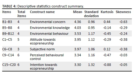 With reference to the normality of the data set, no irregularities were identified as all kurtosis and skewness values fall in the valid range of -2 and +2, as such the data can be deemed as normally dispersed (Berndt & Petzer 2011). The negatively skewed values indicate high scores in the distribution; in other words, the mean fell within the agreement area of scale responses. The standard deviation values recorded for each construct indicate variability in participants' answers to items in that scale. The lowest standard deviation value (standard deviation [SD] = 0.95) was recorded for the environmental knowledge construct, exhibiting low variability of responses. Conversely, the highest standard deviation value (SD = 1.32) was recorded for the intention towards ecopreneurship construct, indicating larger variability of responses (McDaniel & Gates 2013:458).
