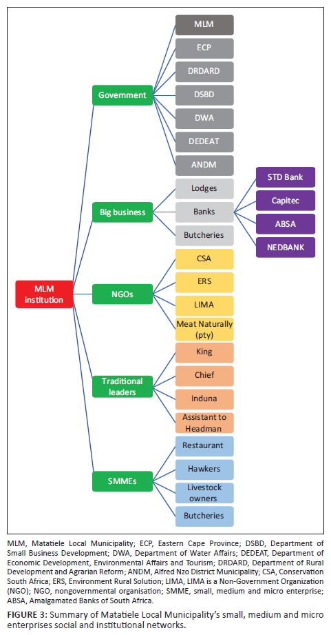Rural SMMEs are also not adhering to industry regulations that will allow them to sell other products, such as meat, to retailers. The MLM senior Local Economic Development officer interviewed explained that they are responsible for assisting the SMME owners with information and knowledge of various industry regulations. The participant pointed out that 'The farmers notify us about the training they want to attend, and based on the information, we either provide them with the transport or funding to attend the workshop'. Figure 2 and Figure 3 summarises the institutional networks in both JLM and MLM.