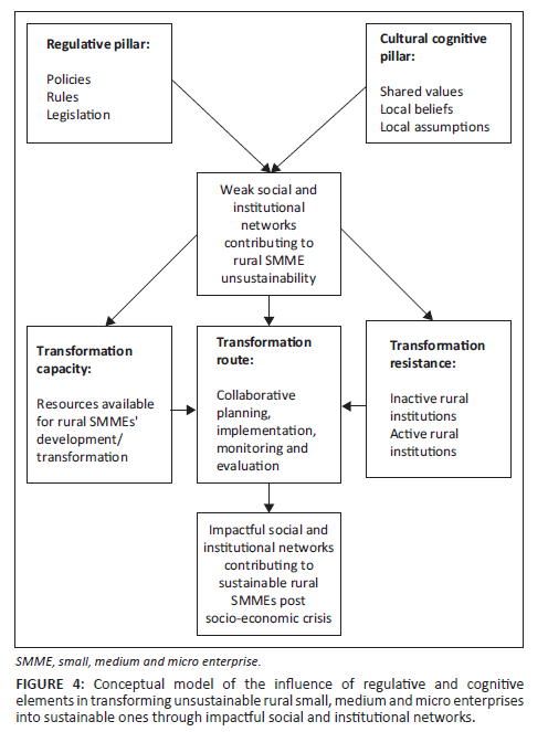 The lack of such diversity impacts negatively the much-needed SMME networks. Such an analysis is consistent with that of Mashavira et al. (2021), Munyanyi et al. (2021) and Kuckertz (2019), which pointed out that diverse SMMEs have the potential to create a wider market and have a positive impact on local livelihood outcomes. What follows is a proposed conceptual model of the influence of regulative and cognitive elements in transforming unsustainable rural SMMEs into sustainable ones through impactful social and institutional networks.