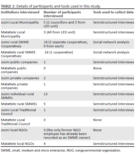 This study employed a qualitative research methodology. An interpretive paradigm was chosen for this study because of its ability to provide an understanding of people's lived experiences (Chilisa 2011; Mertens 2009). In line with the interpretive paradigm, a social network analysis (SNA), together with one-on-one interviews, was chosen as the research instrument for data collection from two rural municipalities. The study was conducted (as part of a PhD research project) in a space of 2 years during which both primary and secondary data were collected. Secondary data were collected throughout the study period, whilst primary data were collected in 6 months from two municipalities about 800 km apart from each other. This meant that time was set aside for each local municipality (Jozini and Matatiele local municipalities) that had more participants confirming their availability.
