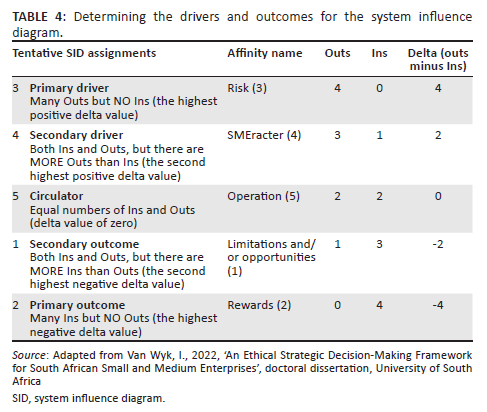 The ART tables identified 20 relationships in total. The Pareto principle was used to determine the degree of consensus on relationships (Du Preez & Stiglingh 2018; Northcutt & McCoy 2004). The Pareto principle considers close votes and identifies conflicting relationships. Through this method, the cumulative frequency (present), cumulative frequency (frequency) and power analyses were determined. The cumulative frequency (frequency) and power analyses determined the most optimal relationships to include in the group's system influence diagram (SID).