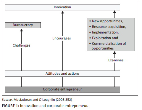 Figure 1 shows the linkage between intrapreneurship, also known as corporate entrepreneurship and innovation, where the corporate entrepreneur encourages innovation through action and the right attitude. In the illustration, the intrapreneur helps to promote innovation within the organisation, bringing about bureaucratic challenges while acquiring new opportunities and implementing and exploiting others. This brought about innovation within the organisation.