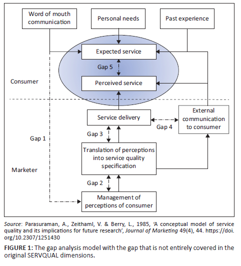 Service quality is a broad concept that includes providing the services and the outcomes after that (Ahmed et al. 2017). The most used tool to analyse the performance of a service industry is the SERVQUAL model proposed by Parashuraman, Zeithaml and Berry (1985). SERVQUAL is a tool used to measure the difference between customer's expectations and customer's perceptions, and it is also known as the Gap Analysis Model (Caruana, Ewing & Ramaseshan 2000; Gajewska & Piskrzyńska 2016; Untaru, Ispas & Dan 2015). The model identified 10 aspects of service quality (Reliability; Responsiveness; Competence; Access; Courtesy; Communication; Credibility; Security; Understanding/knowing the customer and Tangibles) and later classified them into five dimensions (assurance, responsiveness, reliability, empathy and tangibles) (Oakland 2014). These revealed five gaps: knowledge gaps, design gaps, performance gaps, communication gaps and total gaps (Brown 2000).