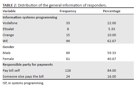 Out of the respondents, there are 62.67% subscribers with 'WE', 22% subscribers with 'Vodafone', 10% subscribers with 'Orange' and 5.33% subscribers with 'Etisalat'. They are also divided into 59.33% males and 40.67% females. A total of 84% of the respondents are responsible for paying the bill by themselves, and 16% are users of the service who are not responsible for paying the bill themselves. These are shown in Table 2 (a, b and c, respectively).