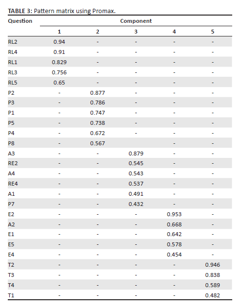 To make an appropriate decision about the number of factors, factor rotation via Promax is conducted so that the factors are interpreted easily. Table 3 suggests that the factors are as follows:
