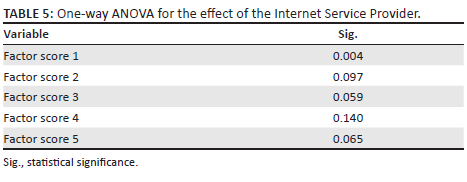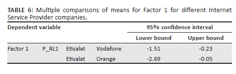 The first step in this analysis is to check the homogeneity of the variance. If the test is significant, then there is a statistical significance that the means are not equal, and hence, robust test of equality of mean based on Welch is used rather than one-way ANOVA. Table 4 shows that we fail to reject the null hypothesis of the test of homogeneity of variance at 95% confidence. Table 5 shows the results of one-way ANOVA. At 95% confidence, the test is significant for Factor 1. We can reject the fact that Factor 1 has the same mean across the different ISPs while we fail to reject the fact that the other factors have the same mean across different companies.