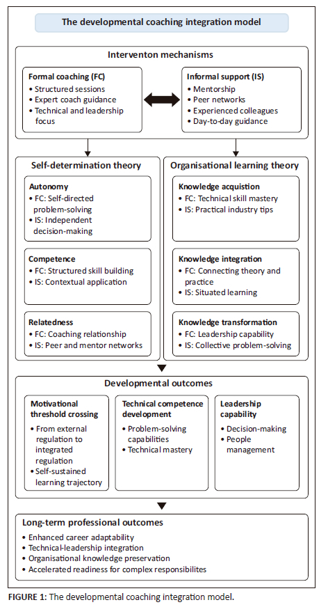 The study is underpinned by an integrated theoretical framework combining Self-Determination Theory (SDT) and Organisational Learning Theory to examine coaching needs of engineering graduates in the South African mining industry. SDT posits that intrinsic motivation and well-being rely on the fulfilment of three core psychological needs: autonomy, competence and relatedness (Ryan & Deci 2020). Coaching addresses these needs by fostering independent decision-making, enhancing skill development and nurturing meaningful professional relationships. For graduates, SDT highlights the importance of personalised coaching interventions that build confidence and support professional growth. Autonomy-supportive coaching environments, particularly for early-career professionals, are associated with higher levels of motivation and job satisfaction (Ryan & Deci 2005). Organisational learning theory focuses on how individuals and organisations acquire, share and apply knowledge to adapt to evolving environments (Garvin 1993). Coaching supports this process by facilitating knowledge transfer, encouraging collaboration, and aligning individual learning with organisational objectives (Lawrence et al. 2023). In industries such as mining, where rapid technological advancements and sustainability challenges require ongoing adaptation, coaching plays a vital role in equipping graduates with the skills necessary to succeed (Senge 2006). These theoretical frameworks are complementary and self-reinforcing when applied to coaching interventions. SDT's focus on intrinsic motivation creates the psychological foundation necessary for effective organisational learning to occur, while organisational learning processes provide structured mechanisms through which the autonomy, competence and relatedness needs identified by SDT can be systematically developed. The integration of these theories is particularly relevant for engineering graduates transitioning from academic to professional environments in technical fields like mining, where both psychological adaptation and knowledge acquisition are critical for success. This theoretical integration informs our proposed Developmental Coaching Integration Model (presented in Figure 1), which illustrates how formal coaching mechanisms and informal support structures work together to address both psychological needs (SDT) and knowledge development needs (Organisational Learning) of engineering graduates. This model provides a conceptual framework for understanding how coaching can be strategically designed to support graduate development in technical fields.