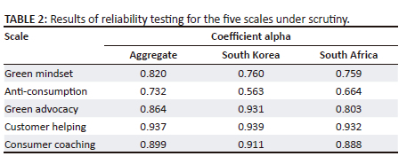 Two primary and three secondary objectives are associated with this study. The initial primary objective is to verify the reliability of the five scales that form the foundation for the current project: green mindset, anti-consumption behaviour, green advocacy, consumer coaching and customer-helping behaviour. This objective involves three secondary objectives: verify the reliability of each of the five scales for the aggregate sample, the South Korean sample and the sample drawn in South Africa. The second primary objective is to determine the extent to which attitudes and behaviours relevant to customer citizenship differ from a green perspective when comparing the results from South Korea to those from South Africa.