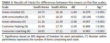 MAIN FINDINGS: Statistically significant differences exist on all five scales. The secondary data favoured South Korea from a green perspective; however, for all five constructs subjected to empirical scrutiny, the results from South Africa produced a significantly higher mean than what was in evidence in the sample of South Korean residents.