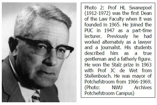 The man who later became the first Dean of the Law Faculty of the PU for CHE, Hendrik Lambertus Swanepoel, was appointed as a part-time lecturer in 1947 and was permanently appointed in 1951.