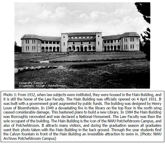 An advertisement to invite prospective students to register for law subjects appeared in an Afrikaans newspaper published in Potchefstroom, Die Westelike Stem, on 24 February 1932. In the advertisement the PUC announced that they would present courses in Law and Administrative Sciences "at times that will be convenient for students who already work fulltime".32