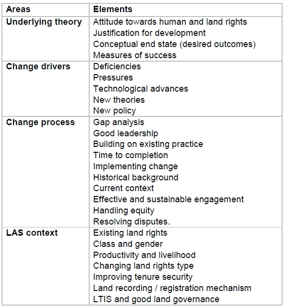 The elements of the underlying theory are the attitude towards human and land rights, the justification for development, conceptual end state,61 and measures of success. These are used in this section to scrutinise the LUA -see Table 1.