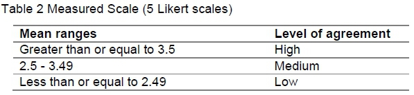 A 5-point Likert scale was used to rank the responses, and for the purposes of this publication only the means of the responses are presented. Table 2 shows how the 5-point Likert scale was graded as high, medium and low.