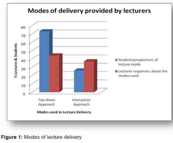 The data did, however, reflect a tension that exists between the students and lecturers regarding delivery modes that were used. While 73 per cent of the students felt that lectures were delivered mainly by the top-down approach, only 23 per cent of the lecturers acknowledged that they used that mode as their main approach of lecture delivery. From the bifurcation in these responses, it can be deduced that there may be varying interpretations of the lecture approach; from either side of the rostrum.
