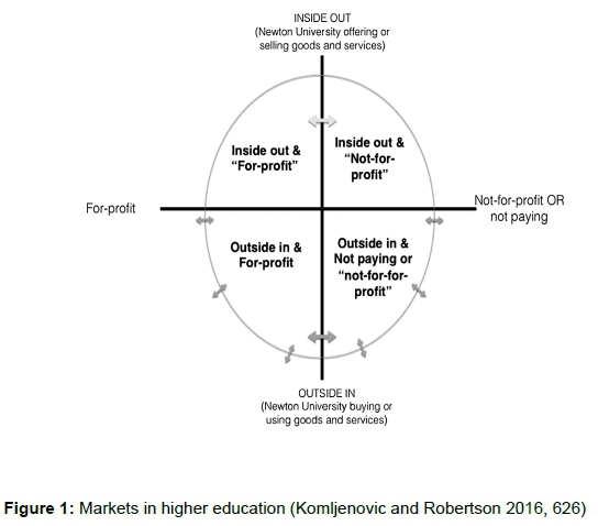 These interactions and intersections are acts of market-making, happening in ways Komljenovic and Robertson (2016, 5) point out are dynamic, diverse and difficult, thus recalibrating and remaking structures, social relations and subjectivities. This is the formation of new kinds of flows fluctuations and negotiations regarding priorities, ideas, practices, foci and intentions. It is in these ways that a convergence occurs of values, cultural shifts and organisational practices, thus reshaping the context within which public sector organisations work. (Ball and Youdell 2008).