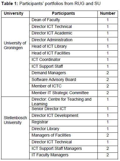 Questionnaires, briefing sessions, document analysis, interviews and observations were used as the data gathering techniques at both universities. A briefing session was developed to capture some answers on the generic IT systems and policy documents of the universities. At RUG, the briefing session was conducted with the IT Director, and at SU, the briefing session was carried out with one director responsible for the ITG issues at the university as well as the IT support manager. These briefing sessions further captured and explained the way IT was structured and defined by different IT committees at the universities. Two main strategic university documents were analysed at RUG, namely the University of Groningen Strategic Plan 2010-2015 and the Multi-Annual Plan ICT 2010-2014. At SU, document analysis was handled differently. In the briefing session at SU, the SU Draft ITG Framework document was presented and used as a basis for carrying out the briefing session. Other three documents sourced from the university website were also analysed; two documents were reports for 2008 and 2012 by the Executive Director of Operations and Finance and the other document was a background summary of the e-campus project. Physical observation of the universities' infrastructures was conducted and the main items that were observed were computer laboratories set-up and access, physical access to buildings, and access to the university network. Interviews at both universities were designed based on the findings from the briefing sessions and document analysis. The findings from the two data gathering techniques assisted author1 who conducted the studies to select a relevant group of people for the interviewing sessions.
