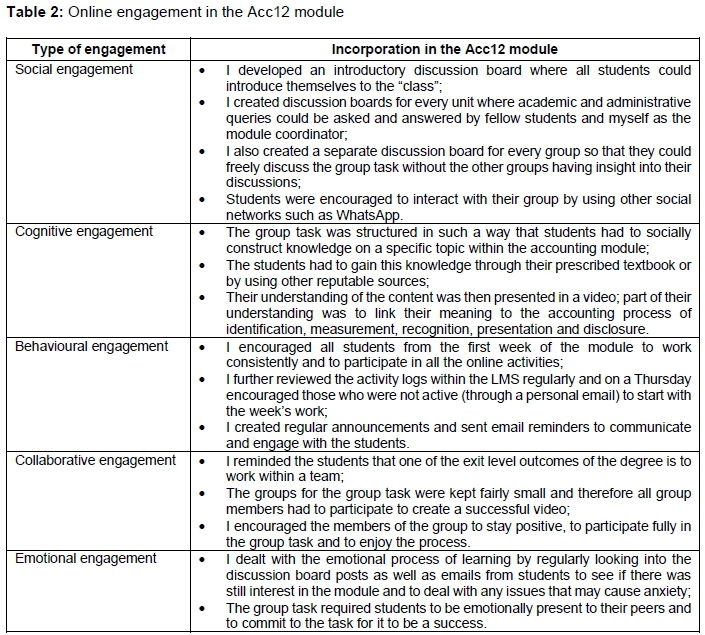 Student engagement is crucial for learning, and especially so in online learning. For a student to be a successful online learner, they need to engage with the online content, with their peers and with the educator. This article presents an accounting module of a fully online degree where engagement was purposefully integrated using an online engagement framework. Within this framework, the educator regularly interacted with the students to ensure that they were engaging with the online material and a group task was assigned where students had to collaboratively construct knowledge and display it in a video. An action research design was followed to determine the degree of engagement within the module and to improve on it for future modules. Results indicate that regular interaction did result in more students being active and ultimately successfully completing the module. Student reflections on the group task indicated that there are definite benefits in creating knowledge collaboratively although the format in which it should be presented needs to be reconsidered.