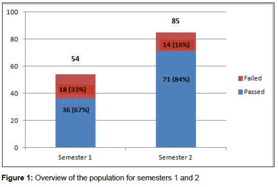 In this section, the results are presented. Figure 1 provides an overview of the two datasets used in this research. Semester two had an increment of 31 (57.40%) in population compared to the 54 students in semester one. The subject pass rate improved from 67 per cent to 84 per cent. Indicators in this analysis substantiate the conclusion of an improvement in pass rate in semester two. At the same time, a decrease is observed in the failure rate of this subject in semester two. The number of failures dropped from 18 to 14 students while the population increased from 54 to 85, resulting in an even lower proportional failure rate.