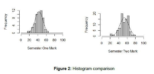 Figure 2 presents a histogram comparison of the marks of the two semesters. Both histograms emulate a data distribution with the bell curve incorporated in them. A high concentration around the mean is observed in semester one and the data appear more skewed to the right in semester two. This observed skewness is further interrogated and discussed later in the text. The spread of the semester one data ranges from 18 to 62 compared with a wider spread in semester two where the data range increased starting from 22 to 76. Not only does the range of semester two start at a higher mark, but it also ends are much higher.