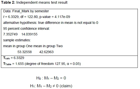 An overview of performance between semester one and semester two is given in Table 1. The top-performing student was in semester two with a mark of 76 per cent compared to the top performer in semester one, who scored 62 per cent. The class average improved from 42.62 per cent in semester one to 53.23 per cent in semester two, an improvement of more than 10 per cent. The marks of students increased from an average of 53.23 with more than 10.44 marks in semester two. This means that there is a wider spread of marks in semester two compared to semester one, where the standard deviation is 9.24. An increase is observed in the measurement indicators of semester two students compared to the students in semester one.