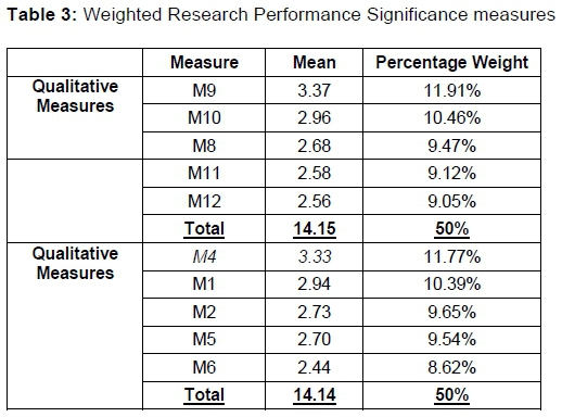 Various data significance measures were generated using descriptive frequencies (see Table 3). The values for mean were then used to determine the significance of each measure/question in the categories/clusters. With a median of at least 3 and a mean of at least 2.5, nine of the twelve research performance measures were found to be significant. The top three measures are therefore qualitative. Table 3 shows the new weights of the various measures after eliminating the two (M7 and M3) less significant measures. The decision to retain M6 (despite having a mean of 2.44) was based on the fact that qualitative measure M9 (Extent to which my research contributes to national interests (e.g., economic development, environment sustainability) is actually a qualitative measure of M6 (Number of new R&D products, processes, or services I have created) and omitting the latter would invalidate M9 which coincidently is ranked the highest.