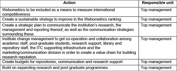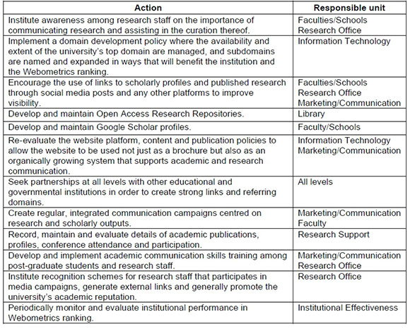 In the current global higher education environment, the impact of digital communications has reverberated, and will continue to do so in classrooms, laboratories, libraries and board rooms. Communicating academic outputs has become as important as communicating course offerings, and with the growth of digital communication platforms, universities must be strategic in positioning their academic and research outputs online. If a university generates research outputs, it needs to be well managed and published in online research repositories and a communications strategy should be in place to create awareness of and links to, this research. Webometrics measures this performance in the international HE arena. Figure 2 illustrates the researchers' interpretation of the Webometrics value chain.