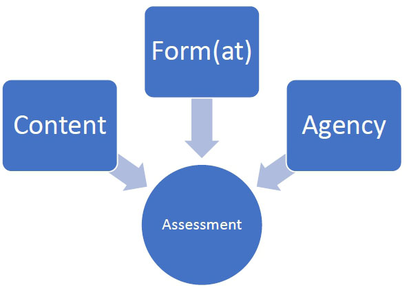 This diagram draws back together some of which has been disassembled in this article: three broad areas which need to be thought through in assessment. Lecturers spend, often, most time thinking through content, some time (at least), thinking through form and format, and very little (generally) thinking through agency. It is my argument that to decolonise we need to pay equal attention to all three, and that all three must be aligned in terms of application and purpose.