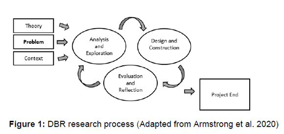 Figure 1, adapted from Armstrong et al. (2020) shows the iterative process of DBR. The research process starts with the identification of the problem, the theory and context (as do most research projects) but then it undergoes cycles of analysis and exploration, moving to design and construction then evaluation and reflection, and essentially redesign, and then a new stage of analysis and exploration and the cycle is repeated.