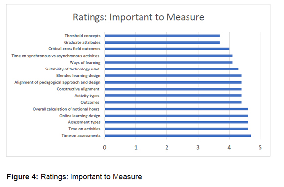 The averages show that the top five factors perceived as most valuable to measure include time spent on assessments, time spent on activities, assessment types, online learning design and the overall calculation of notional hours for the module. Those factors rated as less important to measure were threshold concepts, graduate attributes, critical-cross field outcomes, time spent on synchronous versus asynchronous activities and ways of learning.