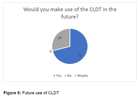 When asked if they would make use of the CLDT in the future, the majority, five out of the seven (71%) said yes, none said no and the remaining two (29%) were undecided. These results indicate that it is likely that that the majority of lecturers would find value in its use.