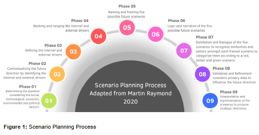 Scenario planning is a trend foresight method in which the possible, probable and plausible future scenarios are created in consideration of the social, technological, economic, environmental and political factors (Raymond 2020). The scenario planning process consists of nine phases outlined in Figure 1.