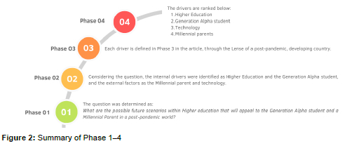 In phase two, all factors are considered, then distilled during phases three and four into only the most important drivers that will impact the future of higher education in South Africa. From the analysis conducted social changes such as generational development of Generation Alpha and Millennial parents were identified in relation to the question from phase one. Furthermore, socio-economic and technological factors such as higher education within a developing country and the development of technology within higher education were identified in relation to the question from phase one. After identifying the social, economic and technological drivers they are categorised to internal and external factors as part of the distillation phase within scenario planning.