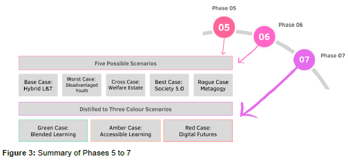 Through contextualising, ranking and ranging the internal and external drivers, five possible scenarios can be proposed as part of phases five and six of the scenario planning process. Each scenario considers the different realities that the internal and external drivers can achieve to factor in every possible future within higher education for generation Alpha (Raymond 2020, 172-177). These scenarios are then distilled into three colour scenarios in phase seven through identifying patterns within each of the basic scenarios to create a more refined future for higher education for generation Alpha (Raymond 2020, 181-188). Each scenario's logic and narrative are then also described as per phase six of the scenario planning process to understand and contextualise the different futures expected for higher education for generation Alpha (Raymond 2020, 188-189). As part of an iterative process, the data related to the scenarios of phase six will be interpreted in phase eight of the scenario planning process (Raymond 2020, 188 -189). The secondary research conducted by identifying the internal and external drivers, applying the scenario planning process and supporting the scenarios with primary data, will be contextualised into a scenario matrix as a more practical form of implementation into higher education learning and teaching models (Raymond 2020, 188-189). A summary of Phases 5-7 can be seen in Figure 3.