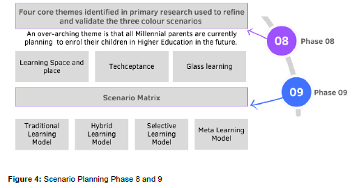 To conclude Phase 9, the implications of the scenario planning matrix are outlined to represent the outcomes of implementing the learning and teaching models derived from the scenario matrix into higher education development.