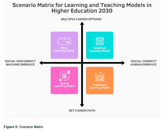 To address the various demands of Gen Alpha, the scenario matrix represents four possible future scenarios for higher education learning and teaching models including the traditional learning and teaching model, the hybrid learning and teaching model, the selective learning and teaching model and meta-learning and teaching model.