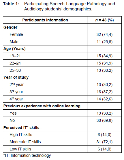 Most participants were female (n=32; 74,4%), with 69,8 per cent of participants being between 19 and 24 years of age (n=30). The ages of participants ranged between 19-30 years old with a mean age of 23,8 years. Responses received included students from all three year groups with nearly equal distribution. Only 13 participants (30,2%) reported previous experience with online learning. Most of the participants (n=31; 72,1%) perceive their IT skills to be moderate.