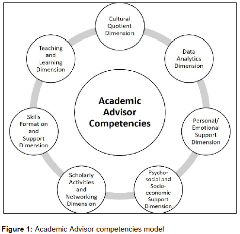 The authors' intention with developing and providing this model, is to assist faculty deans, university management, and other relevant SA HE stakeholders looking to employ academic advisors. The model is intended to provide these parties with requisite guidelines for identifying suitable candidates for these unique positions. Figure 1 provides a visual representation (clockwise and in alphabetical order) of the seven areas in which the authors propose an academic advisor should be able to perform when assuming a role of this nature.