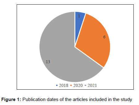According to Figure 1, 13 articles were published in 2021, six were published in 2020, and one was published in 2018. The next Figure presents the number of articles published on each continent.