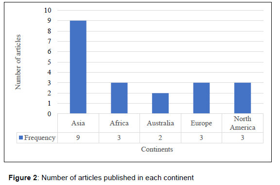 It could be observed that more articles included in the study were published in Asia (9), followed by Africa (3), Europe (3), North America (3), and Australia (1).