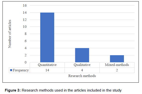 According to Figure 3, more articles included in the study adopted a quantitative study (14), qualitative study (4), and mixed methods (2).