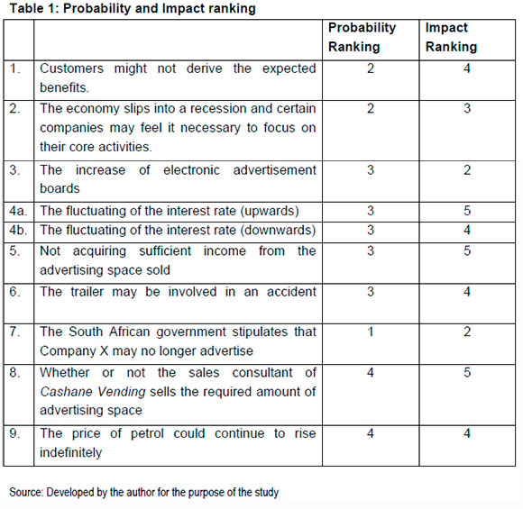 Cashane Vending is a sole owned enterprise that owns and services various cold drink and snack machines within the greater Rustenburg area. The company is currently attempting to shift its focus to mobile advertisement boards and as a result has initiated a project to that effect. Using Cashane Vending as a basis, the tools and techniques of how to identify risks will be explored along with the various categories of risks. The probability and impact of each risk identified within Cashane Vendings project will be discussed and a severity risk matrix will be constructed. Finally risk monitoring and control will attract some attention. The various strategies that Cashane Vending can use should their risks materialise will also be examined.
