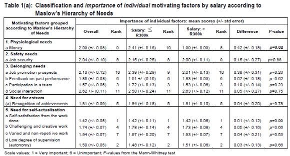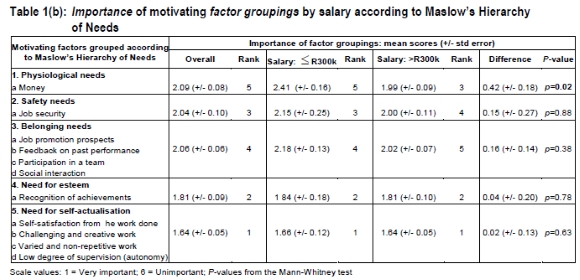 The relative importance (ranking) of each Maslow factor was then determined from the mean Likert scores. Composite variables (with scores for each participant), derived from the original questions, were created for each Maslow group that was associated with more than one question. The means of the factor groupings, along with their standard errors, differences, and associated p-values are displayed in Tables 1(a) and 1(b). This approach meant that a person with a missing value for any of the questions was effectively excluded.