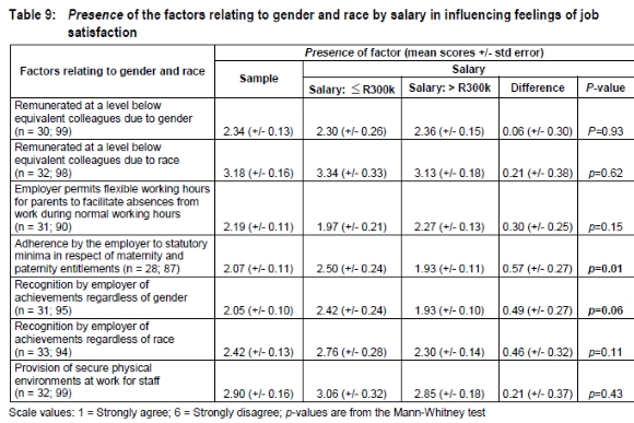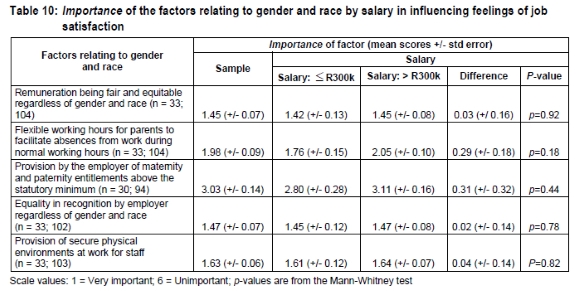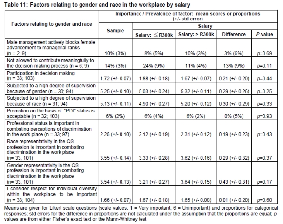 Using 6-point Likert scales, the presence and importance of factors relating to gender and race, with respect to salary category, in influencing feelings of job satisfaction were determined and are shown in Tables 9 and 10, respectively. These tables provide the means and standard errors for the whole sample as well as for the two age groupings, and associated p-values. Table 11 summarises the responses of the two groups regarding issues relating to gender and race at work. Means are given for Likert scale questions and proportions for categorical responses. Standard errors for the difference in proportions are not calculated under the assumption that the proportions are equal; p-values are from either the Fisher's exact text or the Mann-Whitney test. The issues covered encompass perceived male dominance at work, participation in decision-making, degree of perceived supervision, promotion on the basis of PDI status, the importance of professional status and gender and race representivity as means of combating discrimination in the workplace, the importance of respecting individual diversity at work, and whether or not respondents had experienced gender or race-based discrimination or harassment at work.