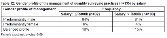 The gender profiles of management in the respondents' practices are shown in Table 12. Table 13 depicts the perceptions of those quantity surveyors whose firms are 'predominantly male' regarding promotion and participation in decision-making in relation to gender (by salary category).