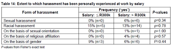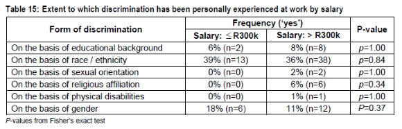 Perceived discrimination in the workplace appears to be more widespread, particularly with regard to race, gender, and educational background. Racial discrimination appears to be the most widespread, being reported by more than a third of total respondents (< R300k: 39%; >R300k: 36%). Despite lower income earners reporting more incidents of racial discrimination at work than higher income colleagues, differences between the two groups are not significant (p=0.84). It is not clear whether the incidences of racial discrimination are 'active' rather than in a 'passive' form associated with affirmative action. These results tend to agree with those of Ellison (2001). In terms of numbers, the higher income group appear to experience more incidences of discrimination across the board. However, there is no statistically significant association between salary and discrimination on the basis of gender (p=0.37), educational background (p=1.00), sexual orientation (p=1.00), physical disabilities (p=1.00), and religious affiliation (p=0.35). Management needs to be aware of the presence of harassment and discrimination in the workplace.
