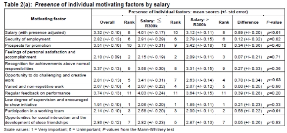 The findings relating to undertaking challenging and creative work with autonomy and receiving recognition within the organisation accord with those of Asad and Dainty (2005) and Dollard et al. (2000). The latter study found that a lack of autonomy and support can result in frustration, job strain and burn-out. Being part of a team, participating in the decision-making process, and being allowed to use one's initiative, relate to the employees' need for empowerment. This finding is consistent with previous research (Hammuda & Dulaimi, 1997) where empowerment was found to be a powerful motivating factor. Empowerment has also been associated with higher morale, improved teamwork, and greater enthusiasm towards work (Umiker 1992). Effective teams and teamwork have been associated with increased output, greater creativity, increased work quality and higher morale amongst team members (Schermerhorn et al 2003). In contrast to the findings of Asad and Dainty (2005), job security and job promotion were not ranked highly as motivating factors by both salary groupings (see Table 1(a)). Given the demands being placed on the industry by preparations for the 2010 Soccer World Cup (large stadia and infrastructure projects), these results are not surprising given the shortage of professional quantity surveyors in South Africa.